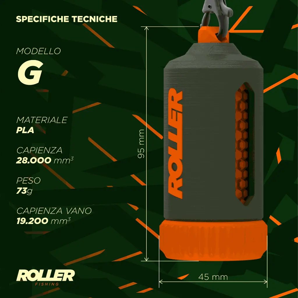 Ogni Roller Fishing è composto da un rocchetto con sistema di avvolgimento (a velcro nei modelli M/MCF, a denti uncinati nei modelli G/GCF) e una campana di protezione agganciata tramite moschettone che mantiene in sede la lenza raccolta. Sul fondo, un vano interno chiuso da tappino permette di raccogliere ami, piombi, mozziconi di sigaretta e altri piccoli rifiuti. Smaltimento responsabile, a portata di tasca.